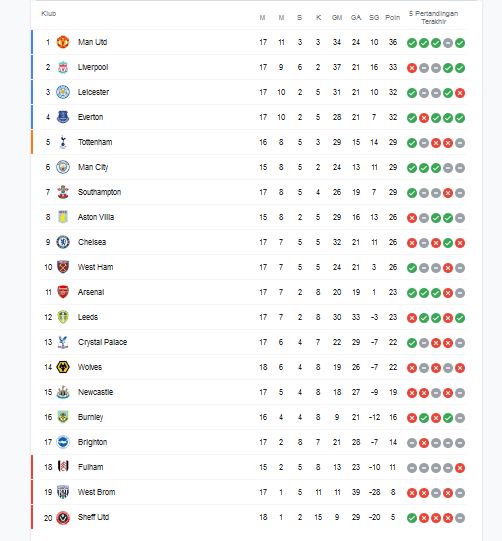Klasemen Liga Inggris 2020-2021 pekan ke-17