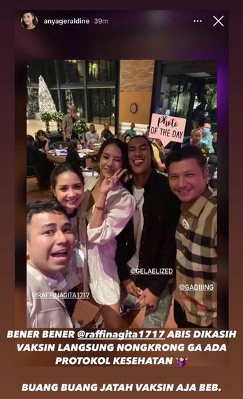 Anya mengunggah foto bersama Raffi, Nagita Slavina, Gading Marten, dan Sean Gelael tanpa menggunakan masker di tempat umum.