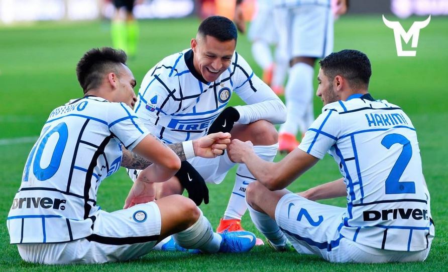 Sundulan De Vrij usai menerima umpan sepak pojok Marcelo Brozovic melambung di atas mistar gawang Salvatore Sirigu.
