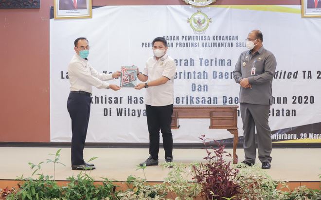 serah terima LKPD Tahun Anggaran 2020 Pemprov Kalsel dan Ikhtisar Hasil Pemeriksaan Daerah (IHPD) Tahun 2020 Wilayah Kalsel dari BPK RI Perwakilan Kalimantan dengan Pemprov Kalsel dan Pemkab/kota, Senin (29/3/2021).