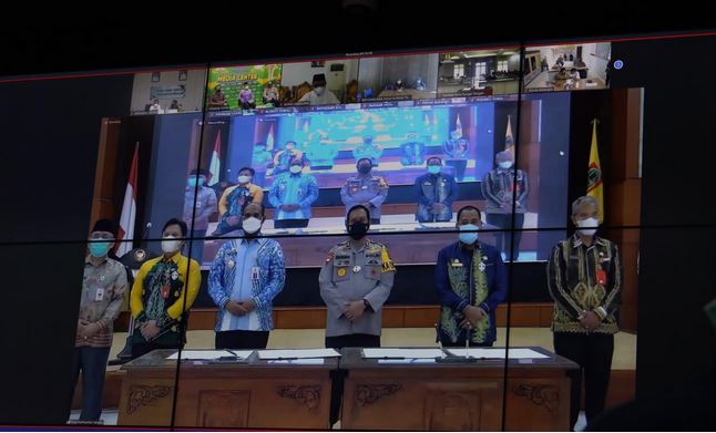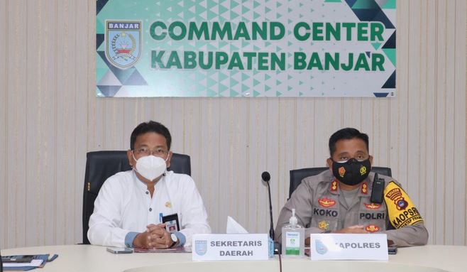 Hadir secara virtual Sekda Banjar HM Hilman, Kapolres Banjar AKBP Andri Koko Probowo di Command Center, Mahligai Sultan Adam, Martapura.