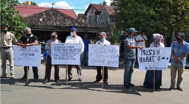 Warga menyuarakan protes terkait penggunaan jalan negara untuk angkutan yg beratnya melebihi kemampuan jalan sehingga merusakan kondisi jalan.