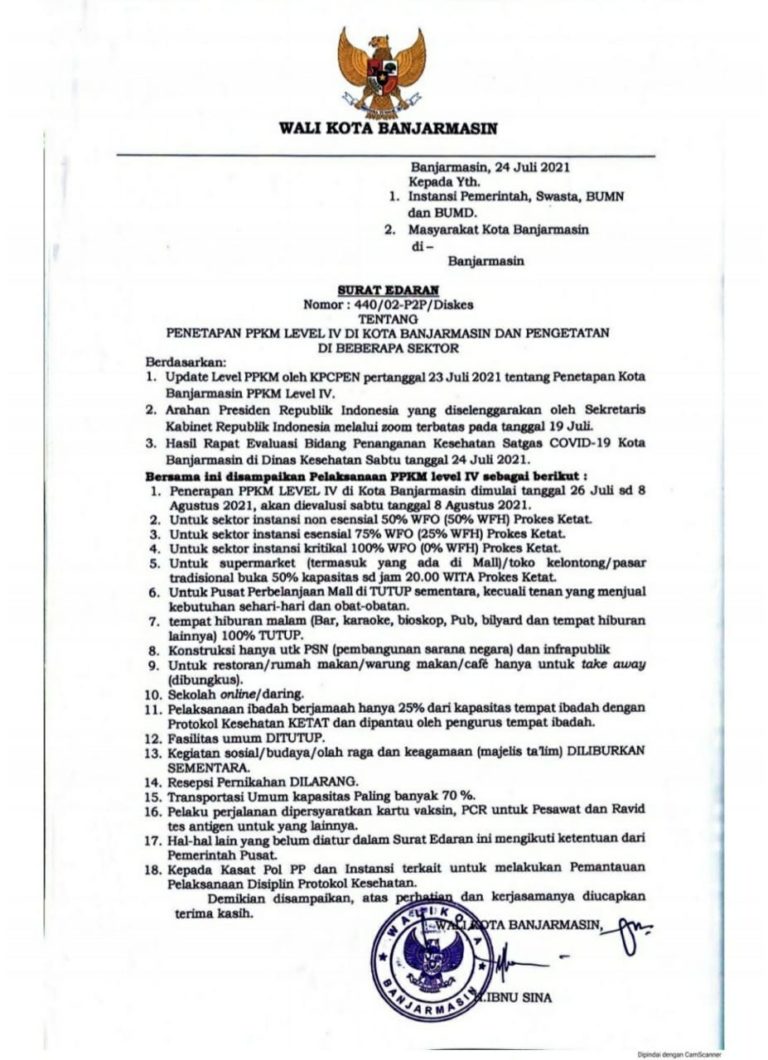 Dalam surat edaran tersebut, ada 18 poin ketentuan yang harus dijalankan selama penerapan PPKM Level IV dan Pengetatan di Berapa Sektor di Kota Banjarmasin.