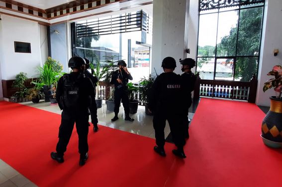 Polisi berseragam lengkap disertai senjata api nampak memeriksa setiap sudut ruangan.