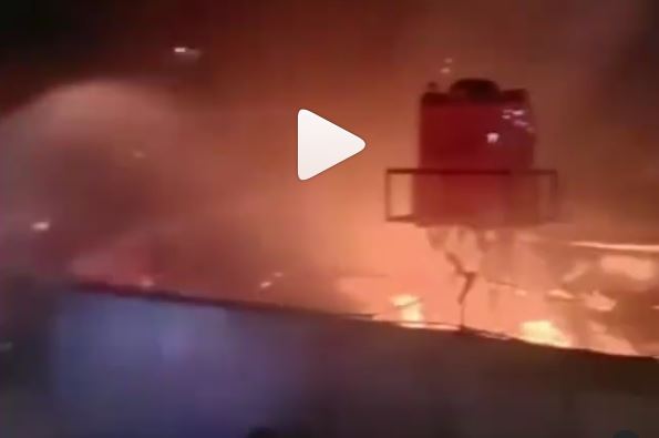 Dalam video terlihat api berkobar-kobar melalap Lapas Tangerang, sementara petugas pemadam menyemprotkan air dari tempat tinggi di luar tembok Lapas untuk memadamkan api.