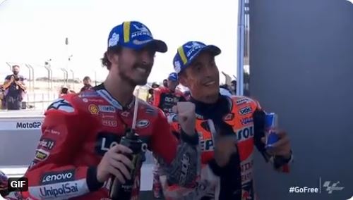 Bagnaia berhasil mengatasi tekanan pembalap Repsol Honda Marc Marquez hingga lap terakhir dan sukses meraih podium pertama.