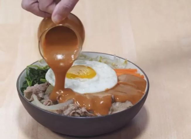 Sajikan tumisan daging di atas nasi bersama sayur-sayuran, telur mata sapi, dan saus Korea.