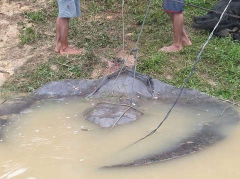 Ikan pari besar yang beratnya mencapai 250 kilogram ditemukan warga di Sungai Batanghari, Desa Pematang Jering, Kecamatan Jambi Luar Kota, Kabupaten Muaro Jambi.