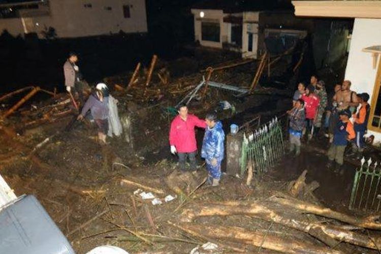 Banjir itu akibat luapan anak Sungai Brantas yang membawa material lumpur dan kayu.