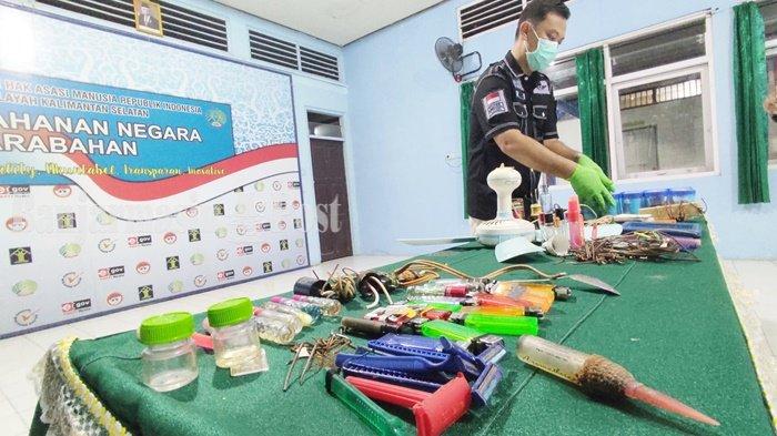 Hasil mengobok-obok seluruh blok ruang hunian pada Rutan Marabahan, Kabupaten Barito Kuala (Batola), Provinsi Kalimantan Selatan, tersebut ditemukan sejumlah benda terlarang dan membahayakan.