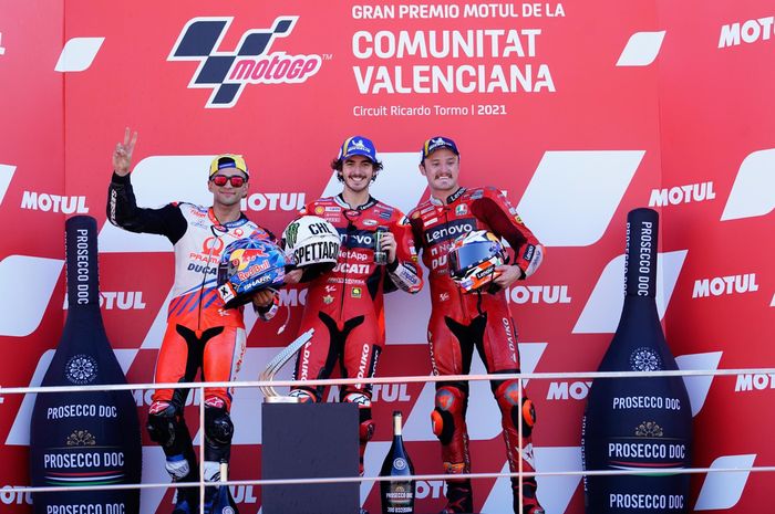 Sementara itu pada balapan penutup MotoGP 2021, MotoGP Valencia di Sirkuit Ricardo Tormo, Spanyol, Minggu (14/11/2021), Francesco Bagnaia (Ducati) menjadi juara.