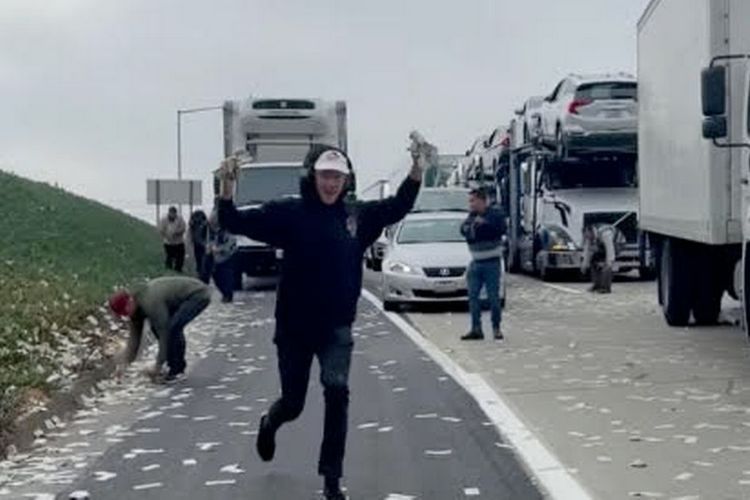 CARLSBAD, KALIMANTANLIVE.COM – Hujan Uang di AS! Pengandara mobil di Amerika Serikat (AS) ramai-ramai memunguti uang kertas yang berhamburan di jalan tol Interstate 5, kota Carlsbad, negara bagian California, Jumat pagi (19/11/2021) waktu setempat.