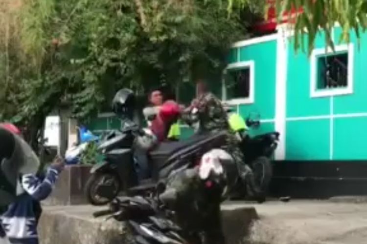 Setelah itu beberapa warga juga berdatangan untuk memisahkan mereka, termasuk seorang warga yang menggunakan jaket loreng TNI.
