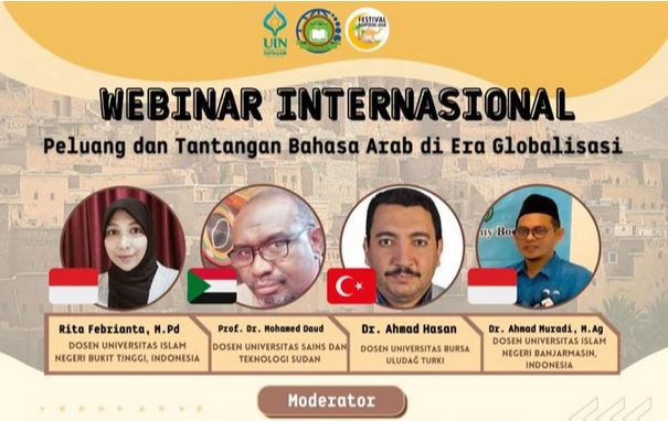 BANJARMASIN, Kalimantanlive.com – Himpunan Mahasiswa Jurusan (HMJ) Pendidikan Bahasa Arab UIN Antasari Banjarmasin menggelar webiner dengan menghadirkan empat narasumber dari tiga negara yaitu Indonesia, Sudan dan Turki, Rabu (1/12/2021) pukul 14.00 hingga selesai.