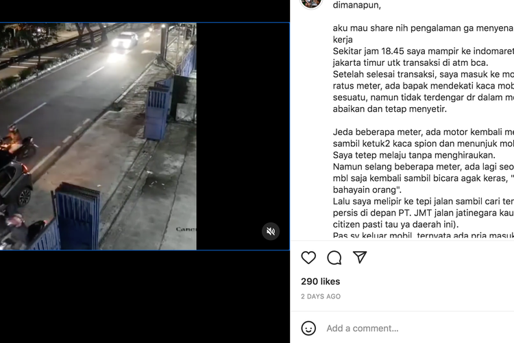 “Jeda beberapa meter, ada motor kembali mendekati mobil saya, sambil ketuk-ketuk kaca spion dan menunjuk mobil belakang saya. Saya tetep melaju tanpa menghiraukan,” tulis akun itu