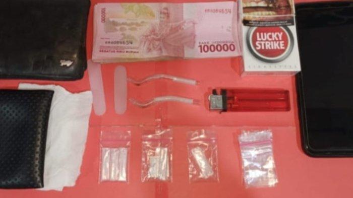 Adapun barang bukti lainnya yang ditemukan berupa 7 lembar plastik klip bening, 2 pipet dari kaca yang di dalamnya diduga masih ada sisa sabunya, 1 kotak rokok, korek api gas dua serok dari plastik warna putih, serta telepon genggam merk Vivo warna biru, dompet kecil, uang tunai Rp. 1.160.000.