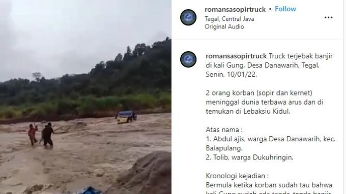 KALIMANTANLIVE.COM – Sebuah video yang memperlihatkan truk pengangkut material terseret banjir dengan arus kuat di aliran Sungai Kaligung, Kabupaten Tegal, Jawa Tengah, Senin (10/1/2022).