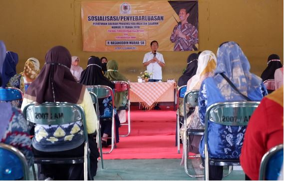 Anggota DPRD Kalsel Hasanuddin Murad, SH saat melakukan sosialisasi Perda Tentang Pemberdayaan Perempuan Dan Perlindungan Anak. di Kecamatan Anjir Muara, Sabtu, (15/1/2022). (Humas DPRD Kalsel).