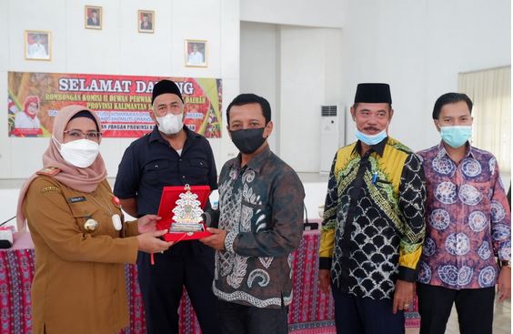 Anggota Komisi III DPRD Kalsel Aris Gunawan menyerahkan plakat kepada Kepala Dinas Ketahanan Pangan Kalteng Sunarti di Palangkaraya, di-sela-sela kegiatan kunjungan kerja ke luar daerah, Selasa (10/1/2022). (foto: Humas DPRD Kalsel).