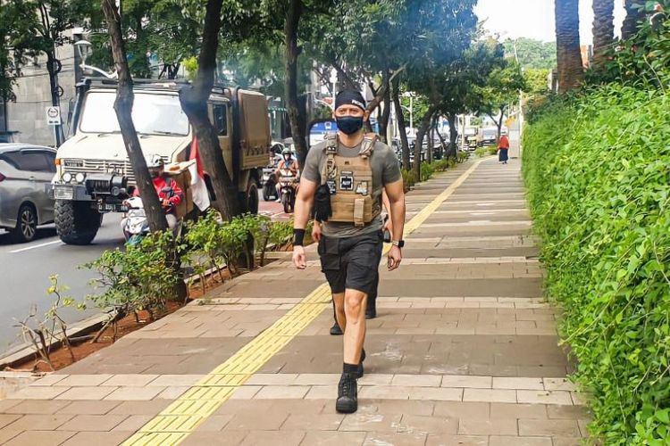 Di foto itu, AHY terlihat memakai celana pendek dan kaus abu-abu lengkap dengan balutan rompi berwarna coklat. Terdapat emblem bertuliskan ‘AHY’ pada rompi bergaya militer itu.