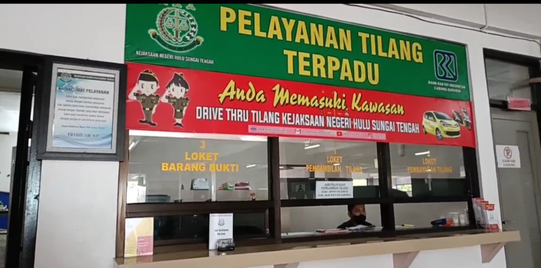 Di kantor pelayanan tilang terpadu yang letaknya di lantai dasar Kantor Kejari HST tersebut dilengkapi 3 loket, 2 loket untuk pelayanan administrasi dari petugas kejaksaan, satu lagi dari petugas BRI yang penerima setoran untuk kas negara.