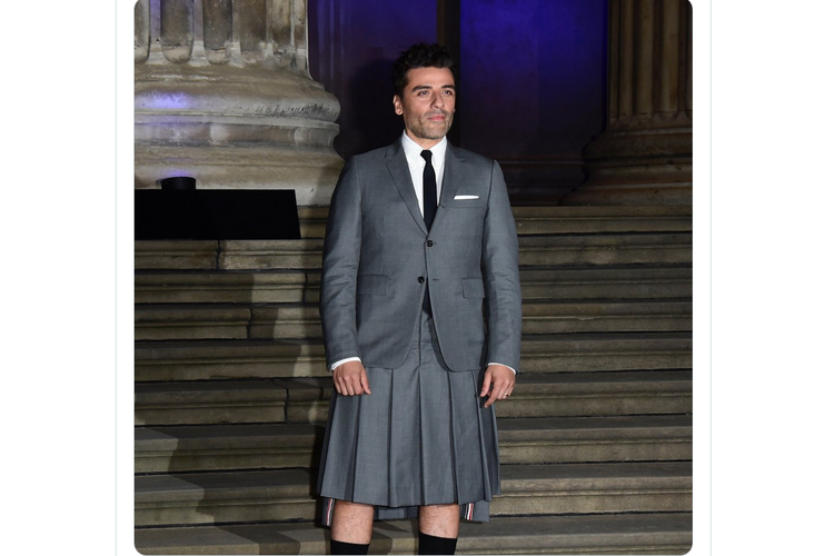 Kehebohan itu karena Oscar Isaac memakai setelan rok rancangan desainer Thom Browne.