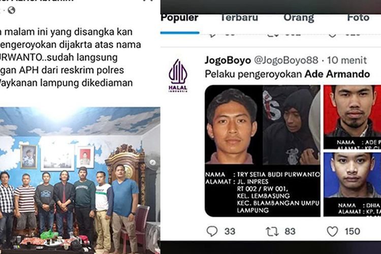 Unggahan di media sosial tersebut menampilkan foto tiga orang yang diduga menjadi pelaku utama pemukulan Ade Armando saat demonstrasi mahasiswa di depan gedung DPR RI, Senin (11/4/2022).