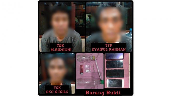 Ketiga pria ini ditangka saat asyik berpesta sabu di bengkel di kawasan Liang Anggang.