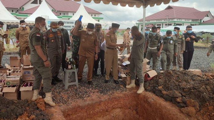 Aroma minuman keras pun sempat tercium dan setelah itu baru kemudian di kubur jajaran Satpol PP agar tidak disalahgunakan.