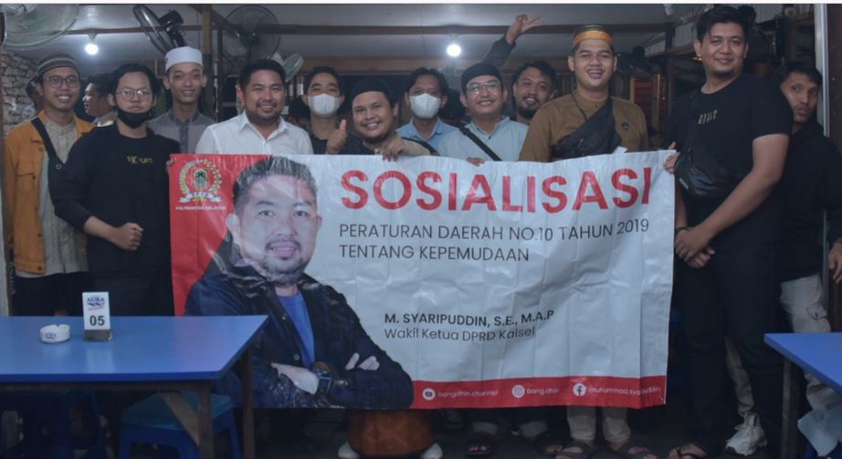 Wakil Ketua DPRD Kalsel M Syaripuddin berdiskusi soal ekonomi kreatif dengan anak muda saat sosper Perda Kepemudaan, di Handil Bakti, Barito Kuala,Selasa (5/4/2022). (Humas DPRD Kalsel)