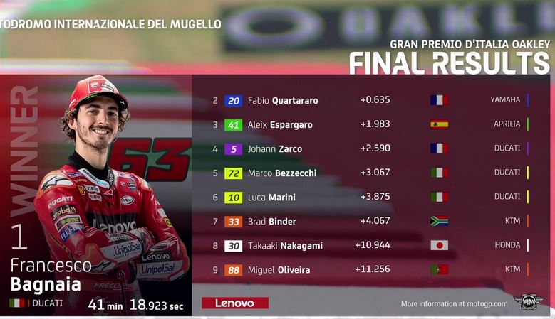 JAKARTA, Kalimantanlive.com – Hasil MotoGP Italia 2022 di Sirkuit Mugello, Minggu (29/5/2022), pembalap Ducati Francesco Bagnaia keluar sebagai juara.