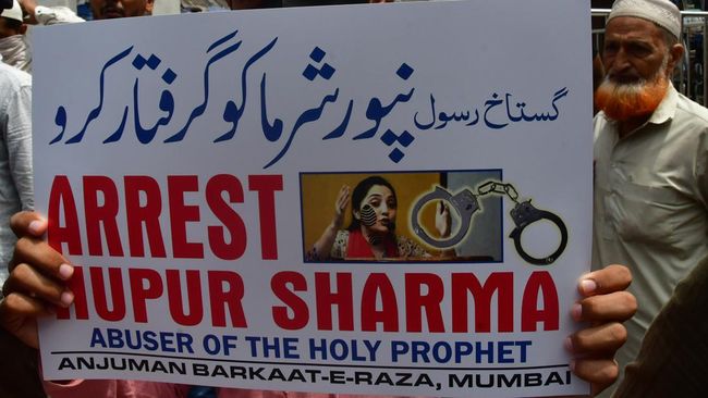 Nupur Sharma, juru bicara partai nasionalis Hindu pimpinan Perdana Menteri Narendra Modi, BJP, pada 26 Mei membuat pernyataan di televisi tentang istri termuda Nabi Muhammad.