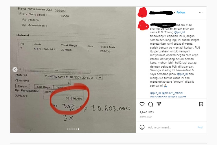 JAKARTA, KALIMANTANLIVE.COM – Seorang pelanggan PLN melalui akun Instagramnya @sharonwicaksono mengunggah beberapa foto yang berisi informasi, bahwa dirinya diminta membayar Rp 68 juta oleh PLN.