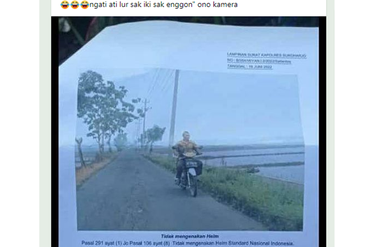Gara-garanya Panto tak memakai helm saat berkendara di area persawahan, warga Kecamatan Wonosari, Sukoharjo ini kena tilang elektronik dari polisi.