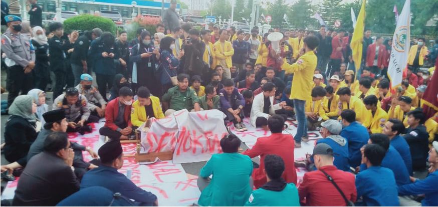 Mahasiswa yang berorasi sambil membawa sejumlah poster besar penolakan pengesahan RKUHP, menuntut Ketua DPRD Kalsel menyampaikan tuntutan mereka ke DPR-RI dan mengancam mengancam akan mengerahkan aksi dengan jumlah massa yang lebih besar jika tuntutan tersebut tidak dipenuhi dalam 2×24 jam.