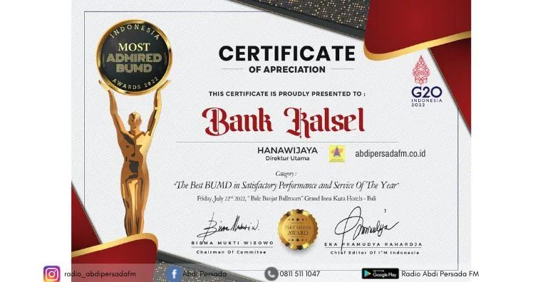 Kriteria penilaian penghargaan ini ditentukan berdasarkan Corporate Sustainability, Corporate Awareness, Corporate Image, Corporate Strength, Corporate Innovation, Media Engagement, Kepuasan dan Loyalitas Nasabah dan Inovasi yang ditunjukkan oleh Bank Kalsel disepanjang tahun 2021.
