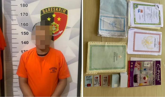 Di kediaman pelaku, polisi menyita sejumlah barang bukti yang digunakan pelaku untuk memalsukan dokumen seperti satu buah laptop merk Lenovo warna hitam, satu printer merk Epson L3110 warna hitam, dua lembar Sim BII umum palsu, satu lembar KTP palsu, 48 lembar blangko KTP palsu, 90 lembar blangko kosong SIM dan NPWP, 62 lembar blangko Kartu Keluarga (KK), 43 lembar blangko kosong akta kelahiran, 5 lembar ijazah palsu, satu pak plastik tranparan sticker, 4 botol tinta print merk Epson serta satu buah HP merk Oppo warna putih metalik.