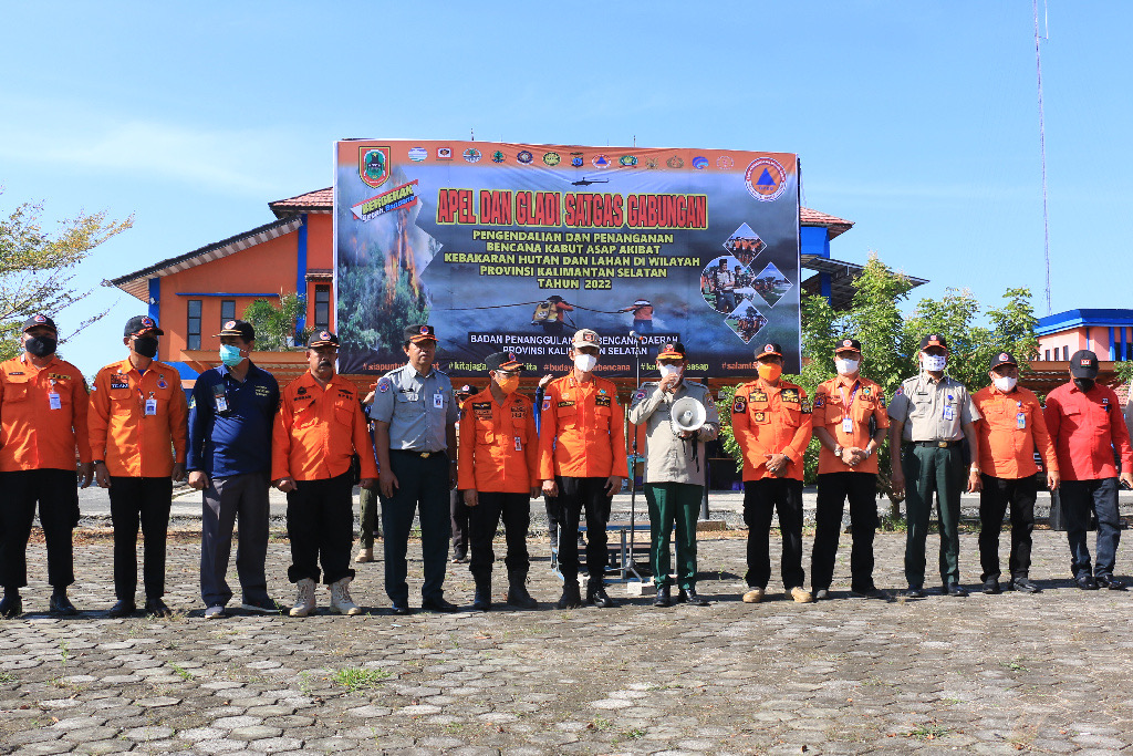Kepala Pelaksana BPBD Kalsel, Suria Fadliansyah memimpin seluruh Kepala BPBD kabupaten/kota pada pelaksanaan Apel dan Gladi Satgas gabungan pengendalian dan penanganan bencana kabut asap akibat kebakaran hutan dan lahan (Karhutla) di wilayah Kalimantan Selatan tahun 2022 di halaman kantor BPBD Kalsel di Banjarbaru.