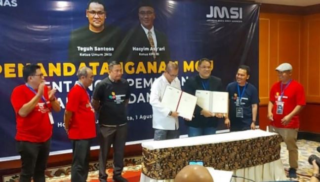 Penandatanganan dilakukan langsung oleh Ketua KPU RI, Hasyim Asy’ari dan Ketua Umum JMSI Teguh Santoso, di sela Rapat Pimpinan Nasional (Rapimnas) JMSI, di Hotel Borobudur, Jakarta, Senin, 1 Agustus 2022.