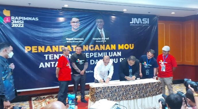 Penandatanganan dilakukan langsung oleh Ketua KPU RI, Hasyim Asy’ari dan Ketua Umum JMSI Teguh Santoso, di sela Rapat Pimpinan Nasional (Rapimnas) JMSI, di Hotel Borobudur, Jakarta, Senin, 1 Agustus 2022.
