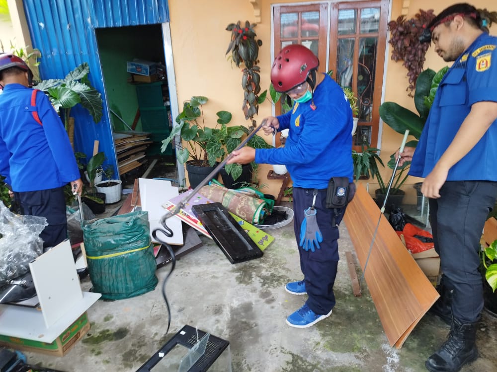 Tidak memerlukan waktu yang lama UPT Damkar Kota Banjarbaru tim SIGAP Regu 3 telah berhasil mengamankan ular kobra hitam tersebut.