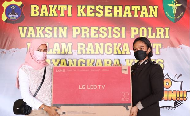 Kapolresta Banjarmasin, Kombes Pol. Sabana menyerahkan undian vaksin merdeka kepada dua orang yang beruntung mendapatkan sepeda dan televisi.