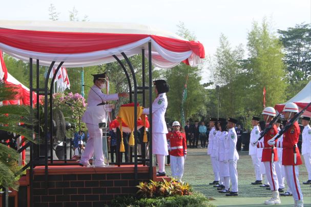 Untuk pasukan pengibar bendera bertugas sebagai pembawa baki bendera pusaka yakni Zahra Septi Suci Ananta siswi SMKN 2 Simpang Empat.