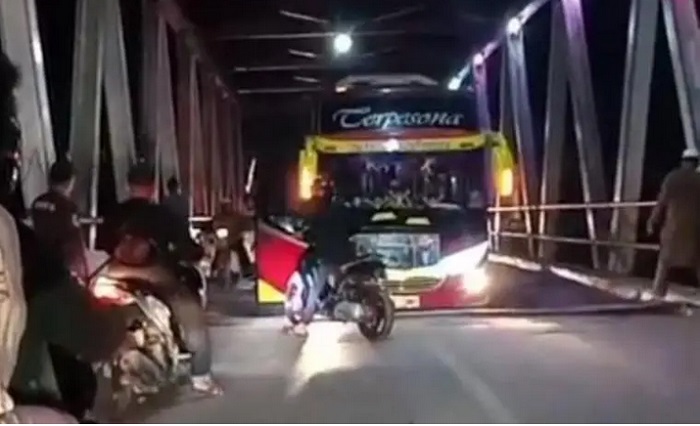 Salah seorang warga, Aldy mengatakan dari informasi yang dirinya dapat lantai jembatan tersebut sudah ambrol akibat bus besar.