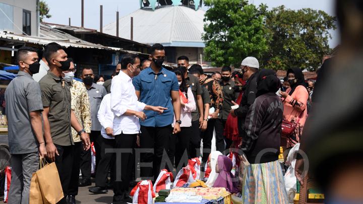 Jokowi langsung menyapa masyarakat dan membagikan bantuan sembako. Dalam kesempatan itu, Jokowi juga membagikan kaus.