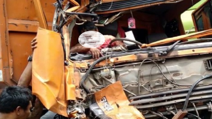 Posisinya terjepit kabin yang ringsek parah terutama bagian depan.