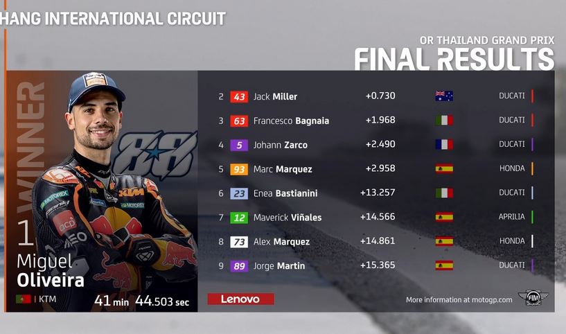 KALIMANTANLIVE.COM – Pembalap KTM Miguel Oliveira memenangi MotoGP Thailand 2022 di Sirkuit Buriram, di tengah kondisi basah, Minggu (2/10/2022).