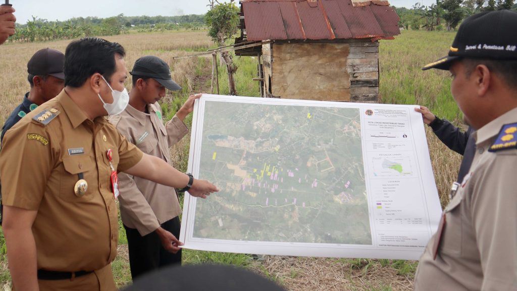 BANJARBARU, KALIMANTANLIVE.COM – Wali Kota Banjarbaru HM Aditya Mufti Ariffin bersama Kepala Badan Pertanahan Kota Banjarbaru meninjau langsung dua lokasi Penelitian Lapang Panitia Pertimbangan Landreform Kota Banjarbaru untuk redistribusi 150 lahan, 45 di Kelurahan Palam dan 105 di Kelurahan Bangkal, Selasa (4/10/2022) pagi.