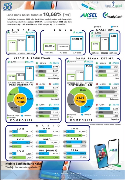 “Bank Kalsel berhasil menunjukkan hasil menggembirakan. Posisi Aset per 30 September 2022 adalah sebesar Rp18,52 triliun, mampu tumbuh sebesar 18,76 persen dibandingkan tahun sebelumnya sebesar Rp15,59 triliun (yoy). Hal ini juga ditunjang dari meningkatnya Dana Pihak Ketiga (DPK), dimana per 30 September 2022 mampu mencatatkan sebesar Rp14,96 triliun atau tumbuh 19,31 persen dibandingkan tahun sebelumnya sebesar Rp12,54 triliun (yoy),” kata Direktur Utama Bank Kalsel Hanawijaya.
