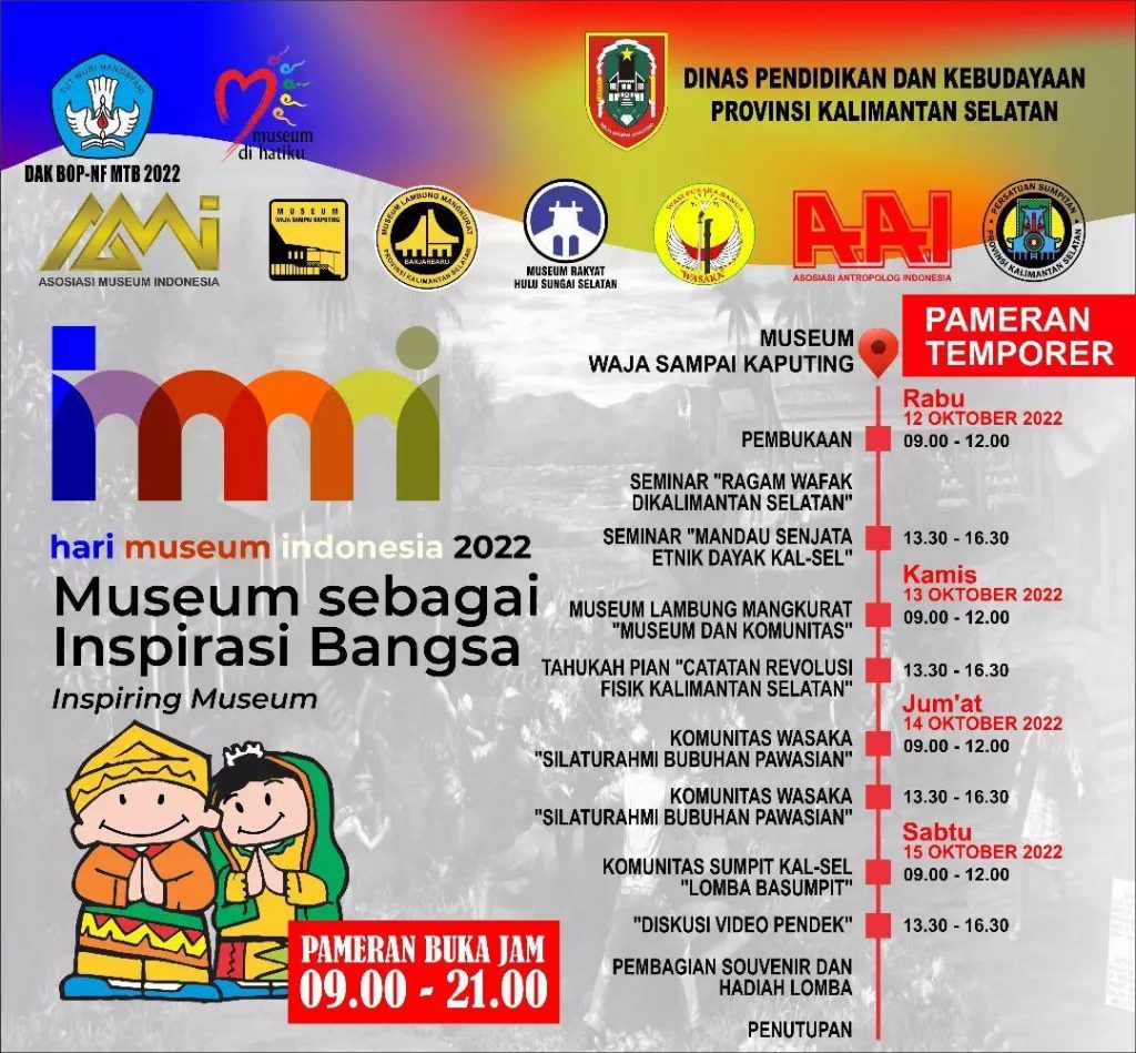 BANJARMASIN, KALIMANTANLIVE.COM – Peringati Hari Museum Nasional yang jatuh pada 12 Oktober 2022, Pemerintah Provinsi Kalsel melalui Dinas Pendidikan dan Kebudayaan Provinsi Kalsel melaksanakan Pameran Temporer di halaman Museum Waja Sampai Kaputing (WASAKA).